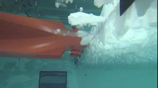 通過先后兩次的冰模試驗(yàn),全面測(cè)試了在北極航行船只的破冰工況,包含中厚陳年冰航道開辟試驗(yàn)、航道突破試驗(yàn)、流冰試驗(yàn)和冰脊穿越試驗(yàn)。