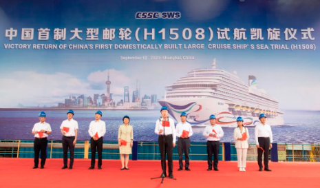 9月12日下午,中國首制大型郵輪“愛達(dá)·魔都號(hào)”經(jīng)過六天五夜1630海里的海上航行,穩(wěn)穩(wěn)靠泊于中國船舶集團(tuán)旗下外高橋造船4號(hào)碼頭。中國船舶集團(tuán)黨組書記、董事長溫剛,黨組成員、副總經(jīng)理孫偉,紀(jì)檢監(jiān)察組組長、黨組成員李佳穎到碼頭迎接。