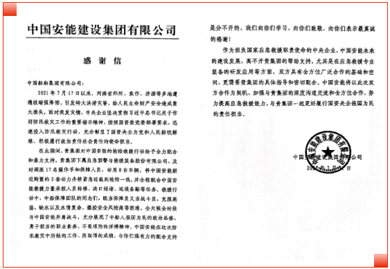 近日,擔(dān)負國家應(yīng)急救援職責(zé)使命的中國安能建設(shè)集團有限公司發(fā)來一封感謝信。