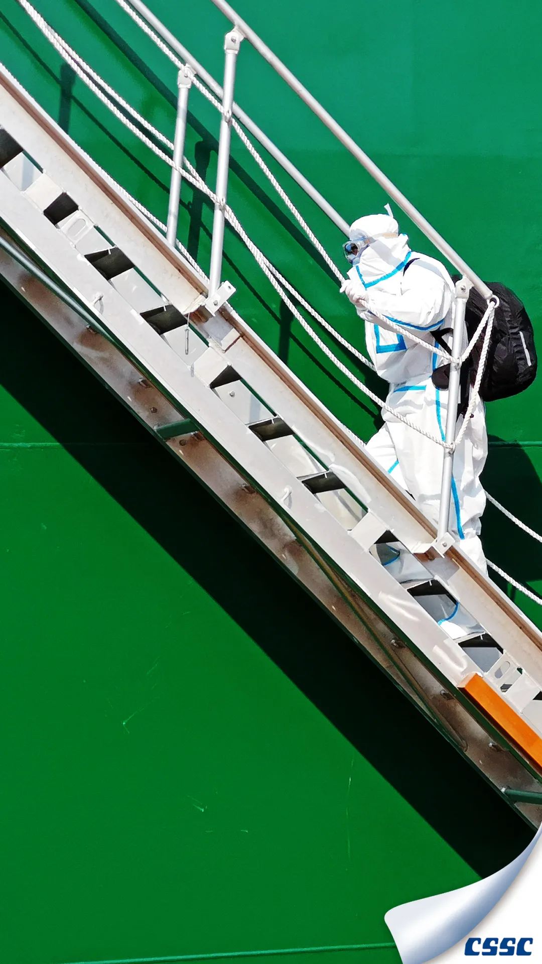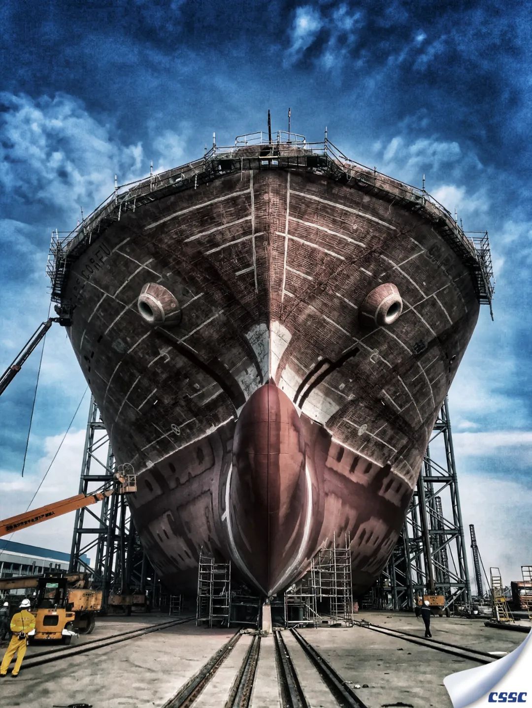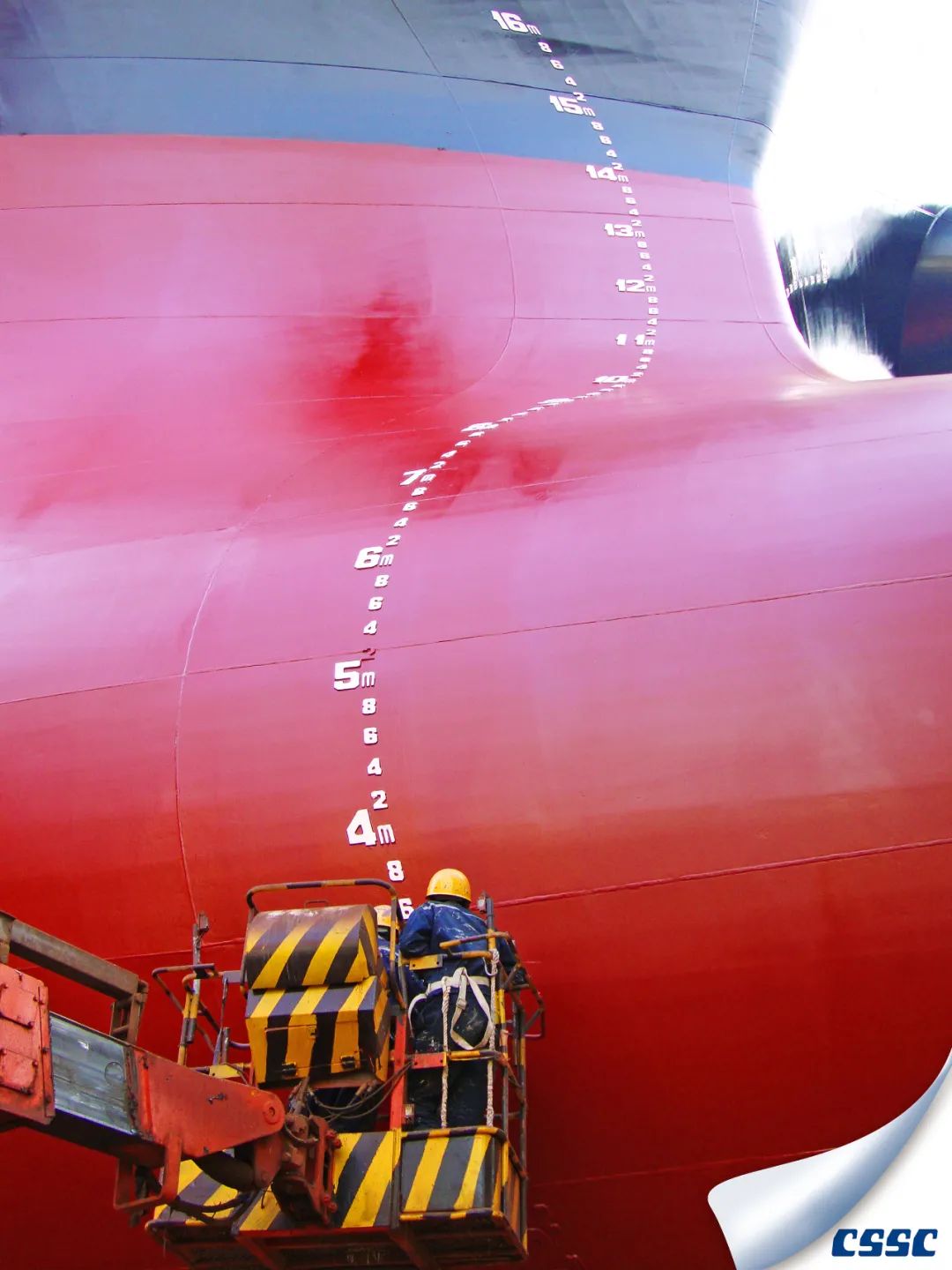 該片拍攝于中船澄西金山塢內(nèi)MARITIME VANESSA (HONGKONG) 船進(jìn)塢油漆涂裝和螺旋槳修理作業(yè)時(shí),創(chuàng)作主要利用船舶與現(xiàn)場(chǎng)作業(yè)人物大小形成超大反差,以獨(dú)特的視角展現(xiàn)了涂裝后新船的雄偉和迷人色彩。