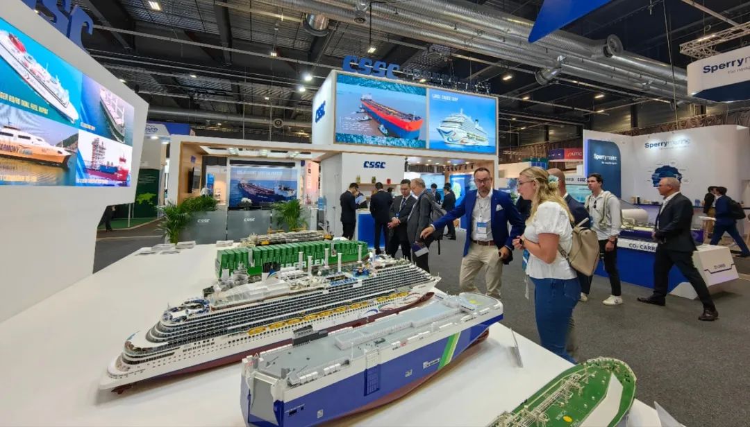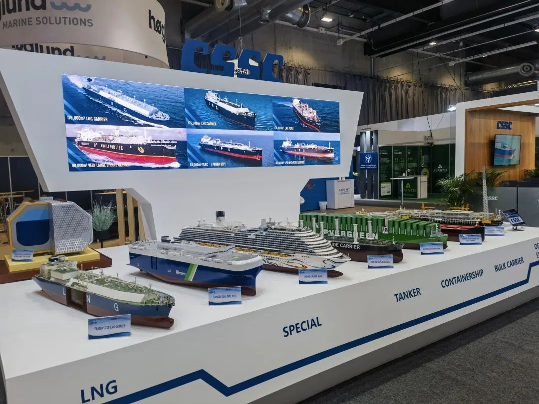 本次展會(huì),中國(guó)船舶集團(tuán)積極踐行“走出去”發(fā)展戰(zhàn)略,緊盯目標(biāo)市場(chǎng)特點(diǎn)和需求,重點(diǎn)展示了近年來(lái)船舶海工及動(dòng)力機(jī)電產(chǎn)品在綠色、低碳、環(huán)保方面取得的最新進(jìn)展和相關(guān)成果,包括全球首制7500立方米液態(tài)二氧化碳運(yùn)輸船、17.4萬(wàn)立方米大型LNG運(yùn)輸船、7000CEU雙燃料汽車(chē)滾裝船、23000TEU超大型雙燃料集裝箱船、21萬(wàn)噸氨燃料散貨船、30萬(wàn)噸級(jí)FPSO、全球首艘10萬(wàn)噸級(jí)智慧養(yǎng)殖工船,以及 12X92DF雙燃料低速機(jī)、LNG供氣系統(tǒng)、船用碳捕捉系統(tǒng)等。集團(tuán)公司展臺(tái)吸引了眾多國(guó)內(nèi)外知名船東、船級(jí)社、設(shè)備廠商等到訪觀摩,交流了當(dāng)前市場(chǎng)熱點(diǎn)并探討了未來(lái)合作機(jī)遇。