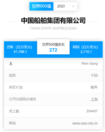 北京時(shí)間2023年8月2日,《財(cái)富》中英文網(wǎng)站同時(shí)發(fā)布2023《財(cái)富》世界500強(qiáng)排行榜,中國(guó)船舶集團(tuán)有限公司以517.991億美元的營(yíng)業(yè)收入位列全球榜單第272位,自2021年重組后首次申報(bào)以來(lái)連續(xù)三年上榜,蟬聯(lián)全球造船企業(yè)首位。