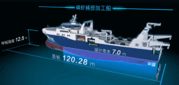 ????“深藍(lán)號(hào)”由黃埔文沖建造,七〇八所參與設(shè)計(jì),總長(zhǎng)約120米,型寬21.6米,設(shè)計(jì)吃水7.3米,設(shè)計(jì)航速15節(jié),主機(jī)功率8000 千瓦,載重噸約5000噸?!吧钏{(lán)號(hào)”是我國(guó)自主研制建造的第一艘漁業(yè)捕撈加工一體船,也是目前最大最先進(jìn)的漁業(yè)捕撈加工一體船,取得近200項(xiàng)知識(shí)產(chǎn)權(quán)保護(hù),實(shí)現(xiàn)了我國(guó)現(xiàn)代化漁業(yè)船舶裝備領(lǐng)域的重大突破,達(dá)到世界先進(jìn)水平;主要用于南大洋漁業(yè)捕撈,兼顧海洋科考功能,可滿足ICE-A冰區(qū)(冰厚度0.8米)及-25℃低溫環(huán)境的營(yíng)運(yùn)要求。