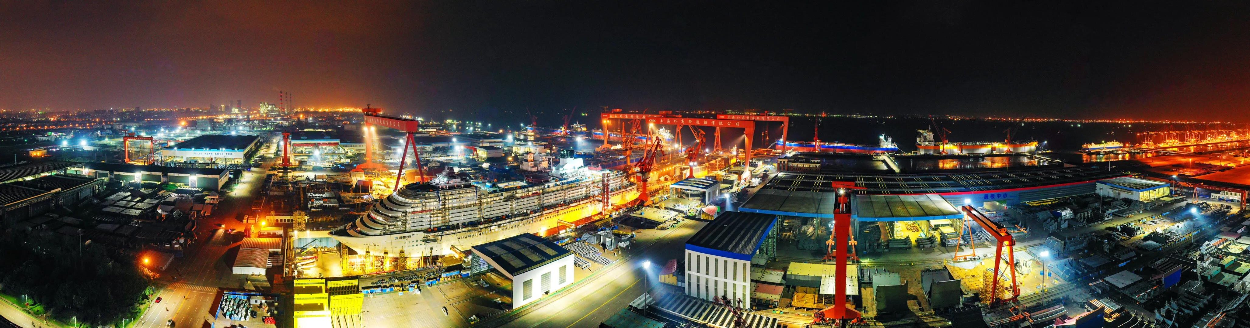 十月金秋結(jié)碩果,外高橋造船提前兩個半月完成了2021年度交船19艘/座的生產(chǎn)任務(wù),燈火通明的廠區(qū)超廣角視圖充分體現(xiàn)了外高橋造船人持續(xù)保障大型郵輪項目高效運行,努力完成民船、海工、郵輪產(chǎn)品的設(shè)計建造任務(wù)、爭取以超額完成全年目標(biāo)的決心和信心。
