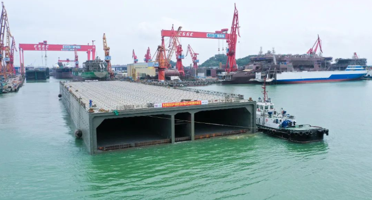 這是中國船舶集團旗下廣船國際35天完成制造、今天交付出塢的深中通道海底隧道沉管E24管節(jié)鋼殼!
