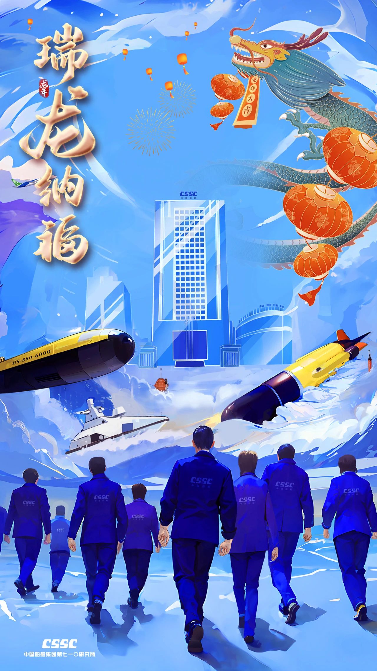 創(chuàng)意說(shuō)明:海報(bào)以七一〇所科研大樓為畫(huà)面背景,以特色產(chǎn)品為主要元素,以科研人員奔赴向前的身影為主角,點(diǎn)綴以五彩龍、孔明燈、彩燈等中國(guó)傳統(tǒng)春節(jié)元素,傳達(dá)出全體員工立志“興裝強(qiáng)軍 科技報(bào)國(guó)”的嶄新姿態(tài)。