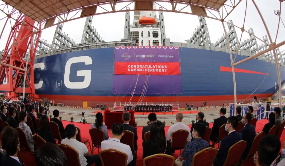 8月27日,由中國船舶集團(tuán)有限公司旗下滬東中華聯(lián)合中船貿(mào)易為法國達(dá)飛海運(yùn)集團(tuán)建造的15000TEU超大型集裝箱系列船首制船“達(dá)飛·和風(fēng)”號(hào)命名交付。這是中法兩國船海巨頭全面落實(shí)2019年中國國家主席習(xí)近平和法國總統(tǒng)馬克龍見證簽署的戰(zhàn)略合作框架協(xié)議的最新成果。同時(shí),也標(biāo)志著“CSSC超大型箱船譜系”又添“新丁”,實(shí)現(xiàn)了對(duì)全球超大型集裝箱船發(fā)展的引領(lǐng)。