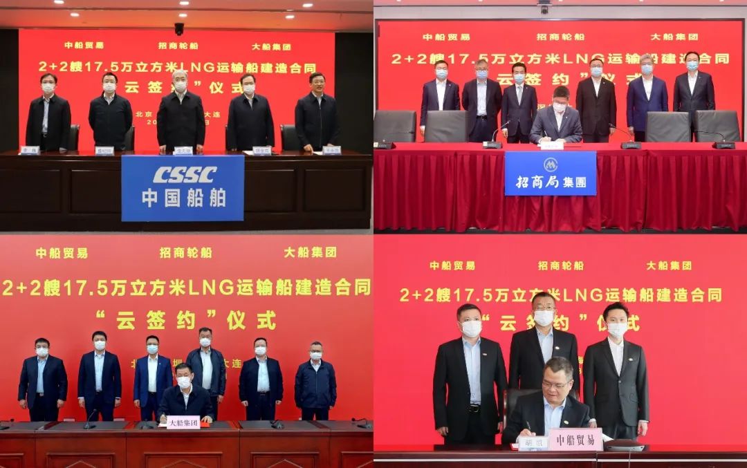 3月31日,中國船舶集團(tuán)有限公司旗下大船集團(tuán)聯(lián)合中船貿(mào)易與招商局集團(tuán)有限公司旗下招商輪船在上海、深圳、大連及北京四地以“云簽約”方式簽署2+2艘17.5萬立方米大型液化天然氣(LNG)運(yùn)輸船建造合同。中國船舶集團(tuán)黨組書記、董事長雷凡培,黨組副書記、總經(jīng)理楊金成,黨組成員、副總經(jīng)理盛紀(jì)綱,招商局集團(tuán)董事長繆建民、總經(jīng)理胡建華、董事王宏出席簽約儀式。雷凡培、繆建民在儀式上致辭。