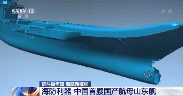總臺央視記者李寧:這艘就是我國第一艘國產航母山東艦,它是2019年12月17日正式入列的,它的高度是二十多層樓那么高,長度三百多米,整個面積能達到三個足球場那么大。