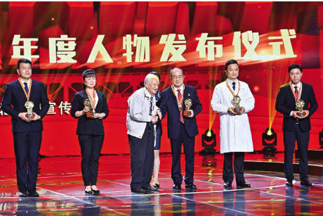 當(dāng)95歲高齡的黃老出現(xiàn)在舞臺上時,張定宇快步向前迎接,這一幕令人動容。黃老在攙扶下,為張定宇戴上獎?wù)?,“能為你頒獎,我感到很榮幸。你是祖國的驕傲,人民的英雄!”