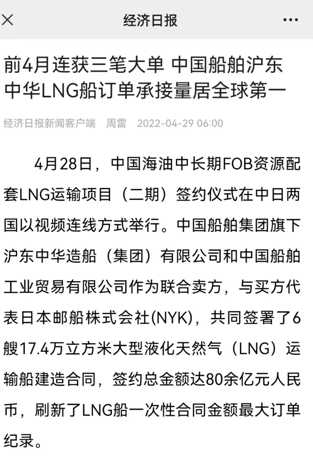 4月28日,中國(guó)海油中長(zhǎng)期FOB資源配套LNG運(yùn)輸項(xiàng)目(二期)簽約儀式,在中國(guó)北京、天津、深圳、上海和日本東京以視頻連線方式成功舉行。中國(guó)船舶集團(tuán)有限公司旗下滬東中華和中船貿(mào)易作為聯(lián)合賣方,與買方代表日本郵船株式會(huì)社(NYK),共同簽署6艘17.4萬(wàn)立方米大型液化天然氣(LNG)運(yùn)輸船建造合同。