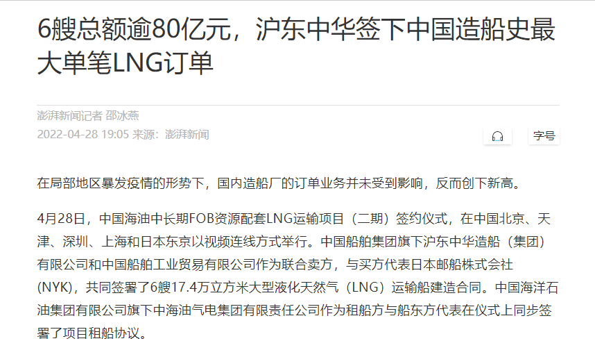這次簽約生效的6艘LNG船總金額達(dá)80余億元人民幣,再次刷新了今年年初創(chuàng)造的LNG船一次性合同金額最大訂單紀(jì)錄。至此,今年前4個(gè)月滬東中華已累計(jì)承接LNG船訂單達(dá)到創(chuàng)歷史紀(jì)錄的17艘,超越韓國(guó)船企傲居全球之首,在實(shí)現(xiàn)簽單質(zhì)量和數(shù)量“雙提升”的同時(shí),進(jìn)一步鞏固了滬東中華在中國(guó)LNG產(chǎn)業(yè)鏈的龍頭地位和領(lǐng)跑優(yōu)勢(shì)。