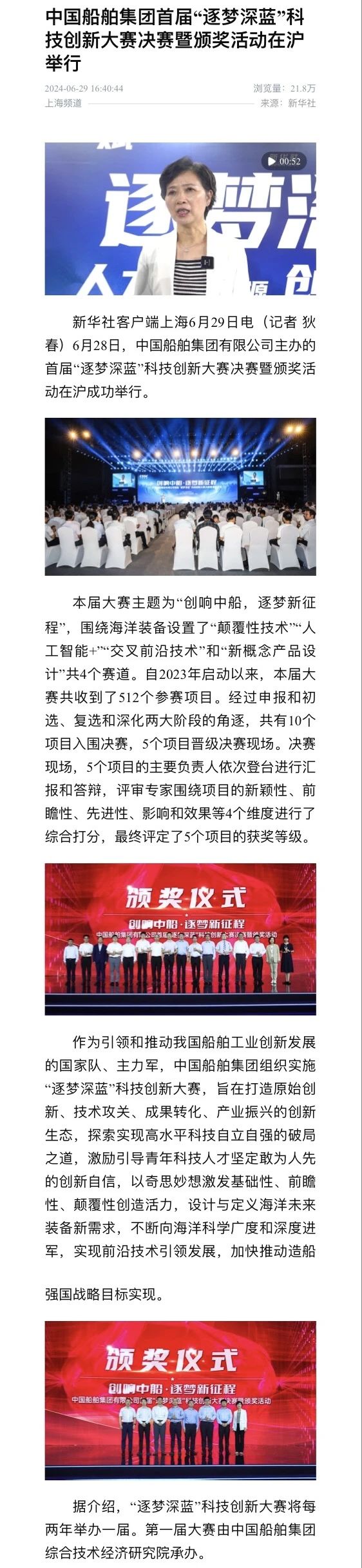 中國船舶集團有限公司主辦的首屆“逐夢深藍”科技創(chuàng)新大賽決賽暨頒獎活動引來各大媒體的關(guān)注,獲得高度評價。——>活動回顧