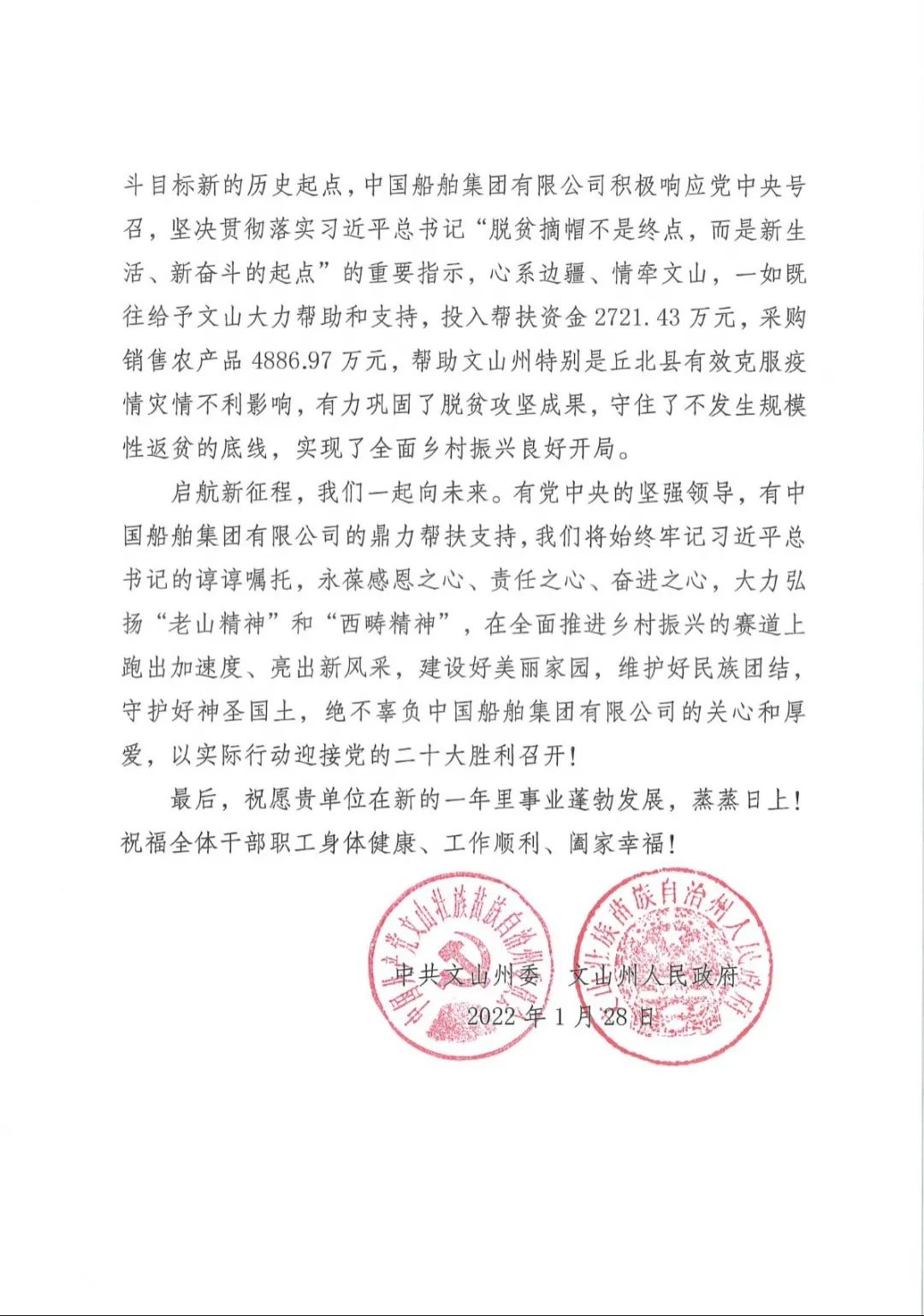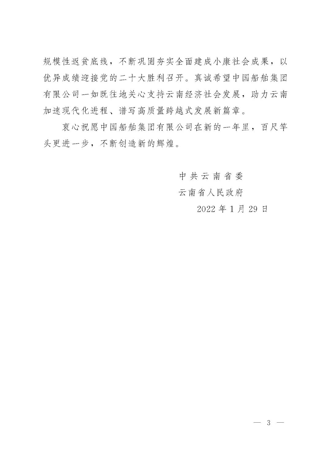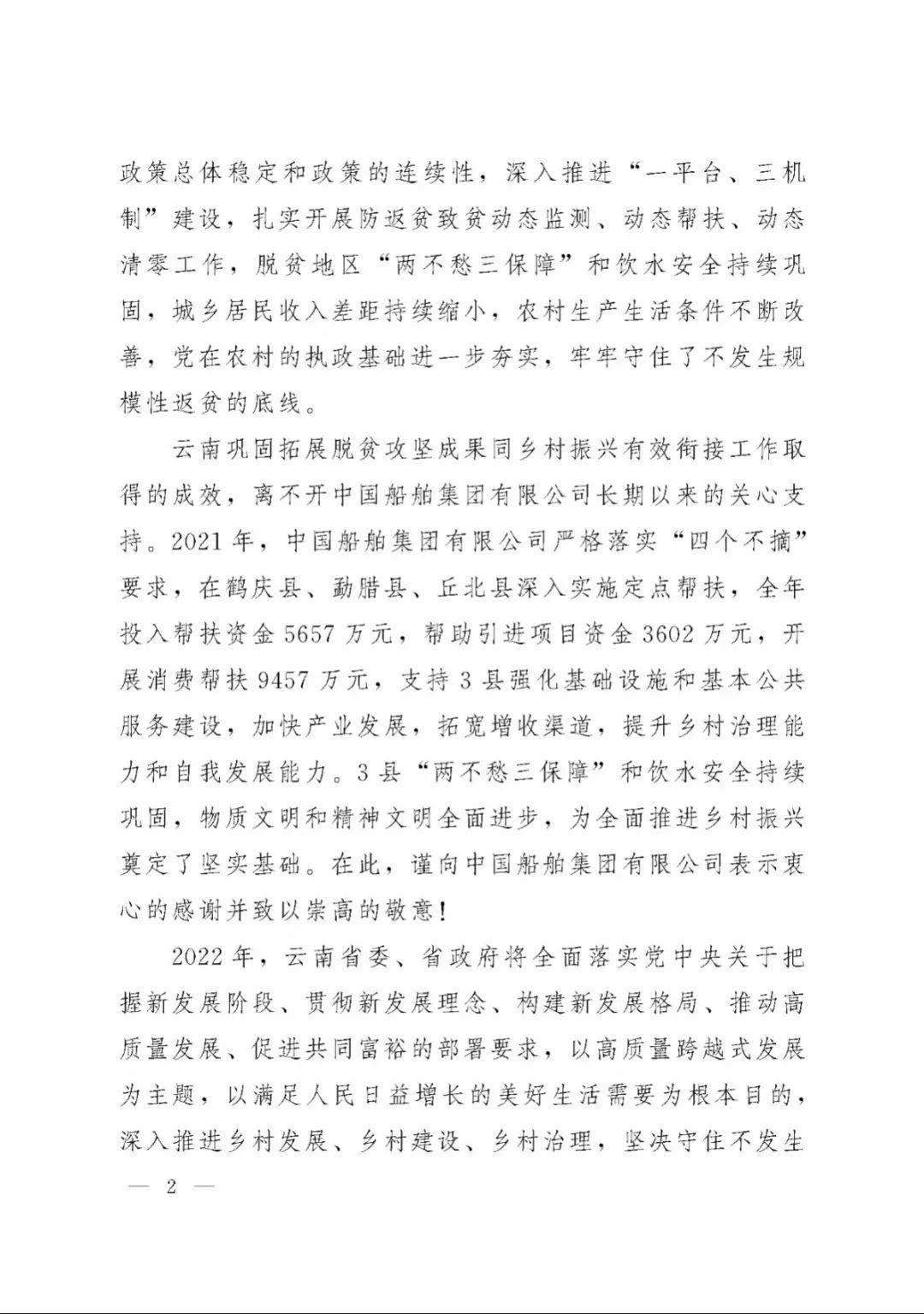 春節(jié)前夕,中國(guó)船舶集團(tuán)陸續(xù)收到云南省委省政府、文山州委州政府、鶴慶縣委縣政府、勐臘縣政府發(fā)來的感謝信,對(duì)集團(tuán)公司長(zhǎng)期以來給予鶴慶縣、勐臘縣、丘北縣的傾力幫扶表示衷心感謝和崇高敬意。